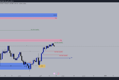 عاود السعر بالصعود وكسر هيكل السوق الهابط داخلياً وتحول للصعود لغاية ما وصلنا لمنطقة BPR كتير مهمة كان متوقع من السعر اغلاق اسفل مناطق ال 50% ومن ثم تواجد دلالة بيعية ومعاودة الهبوط لكن الدعم الاخير يلي صار على الدولار من قبل الاخبار ساعد السعر انو يصعد للاعلى زيادة عن اللزوم