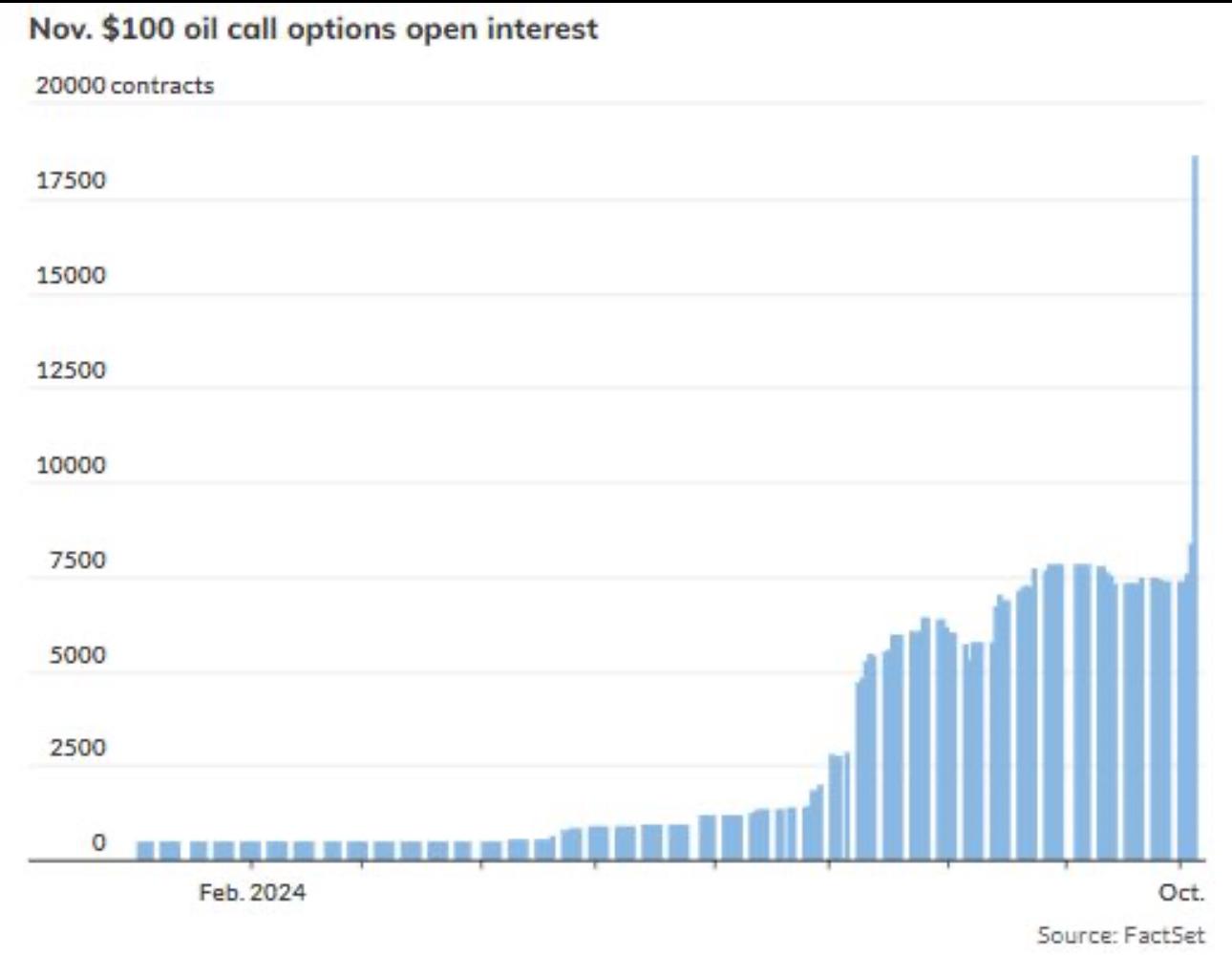 تزايدت الرهانات الصعودية على النفط الخام! شهدت خيارات الشراء لشهر نوفمبر سعر 100 دولار للبرميل وهو أعلى معدل مفتوح على الإطلاق ، مايشير ان الأسواق تتوقع مزيد من التصعيد العسكري في الشرق الأوسط